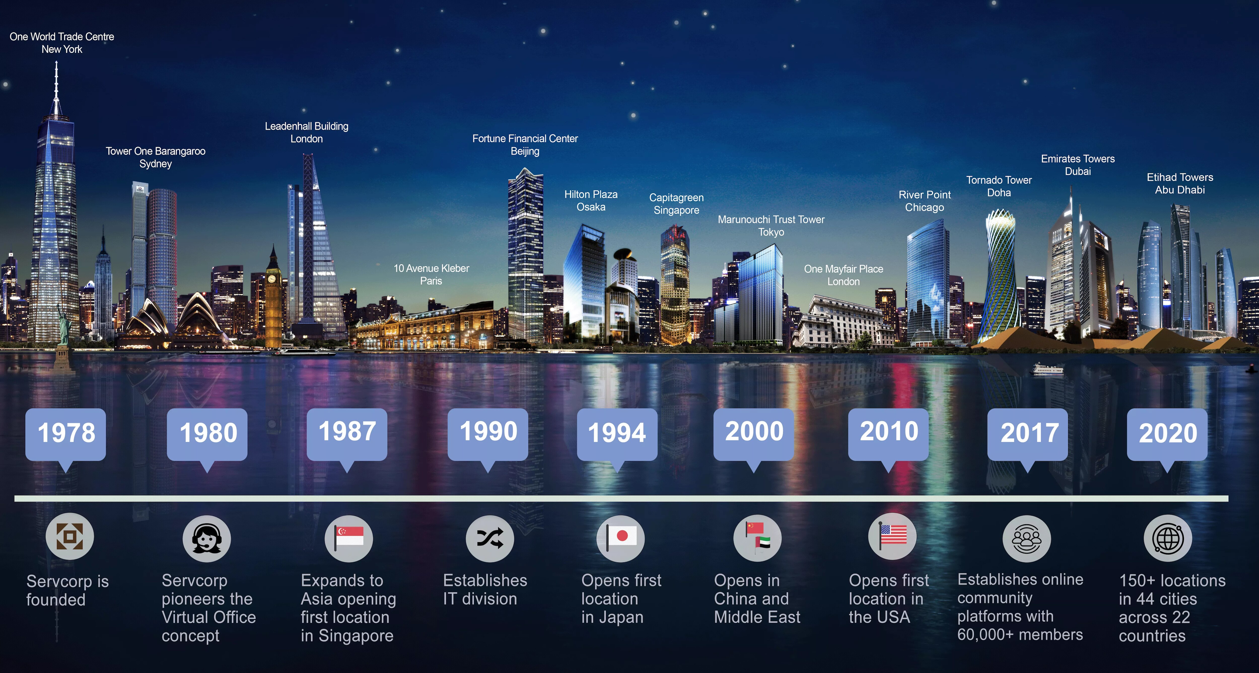 In 1978 from a corner office in the MLC Centre Sydney Australia Mr. Alf Moufarrige took a piece a chalk to divide up the space - and Servcorp was born! The idea took hold and evolved organically and in just 12 months, a full 2 floors within the MLC Centre were occupied along with 1 location in Melbourne.
